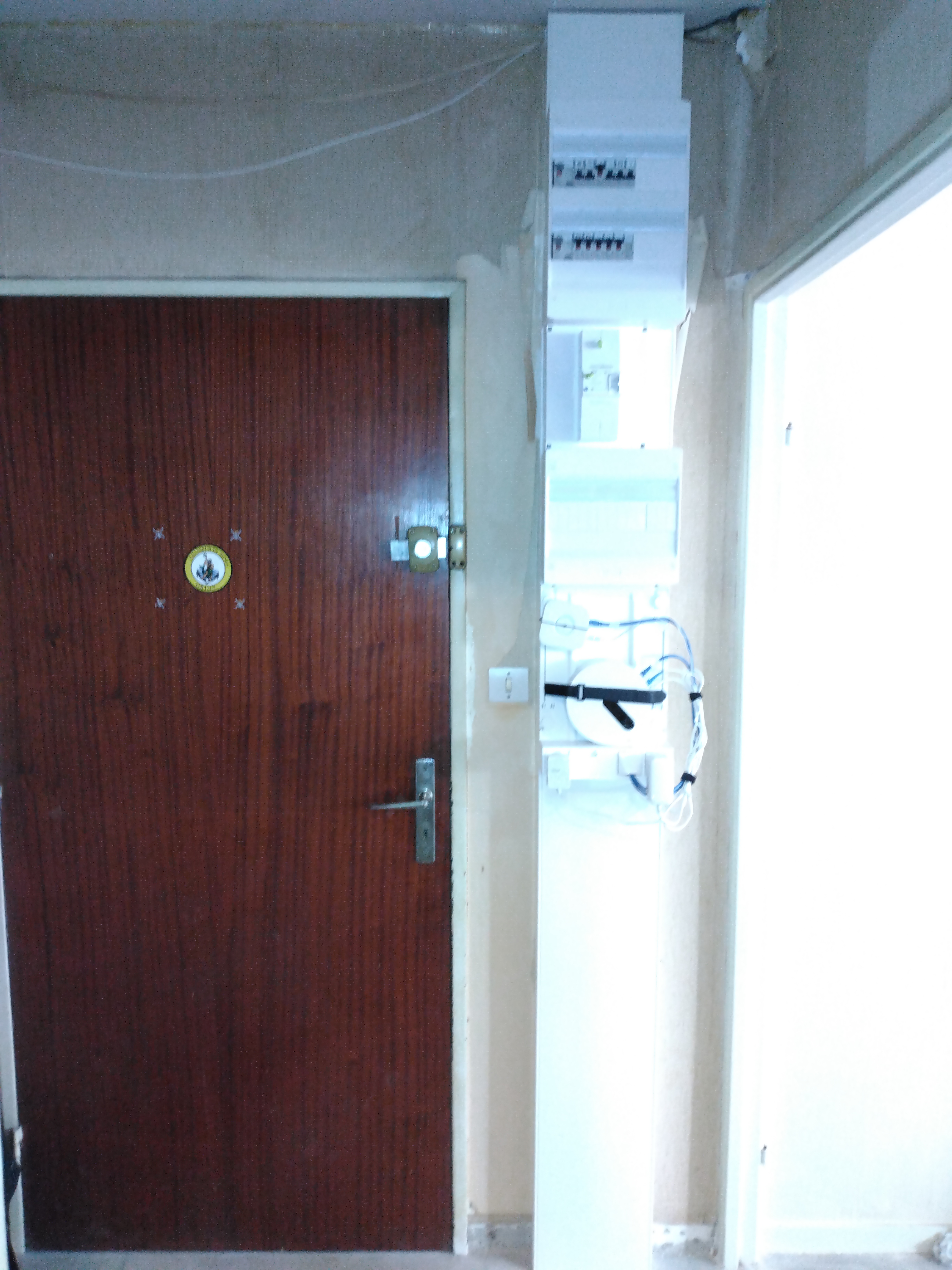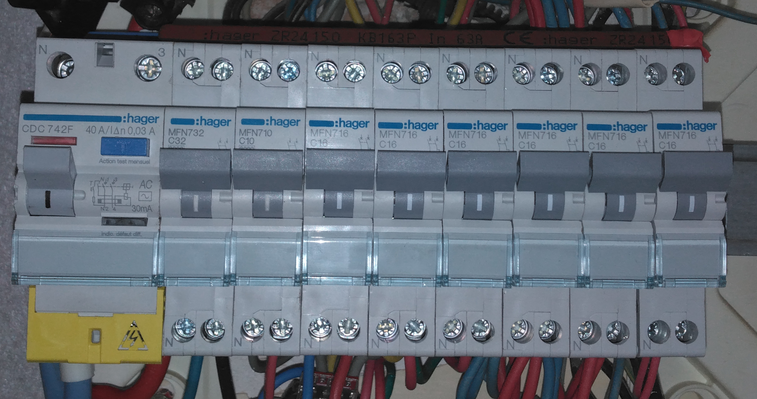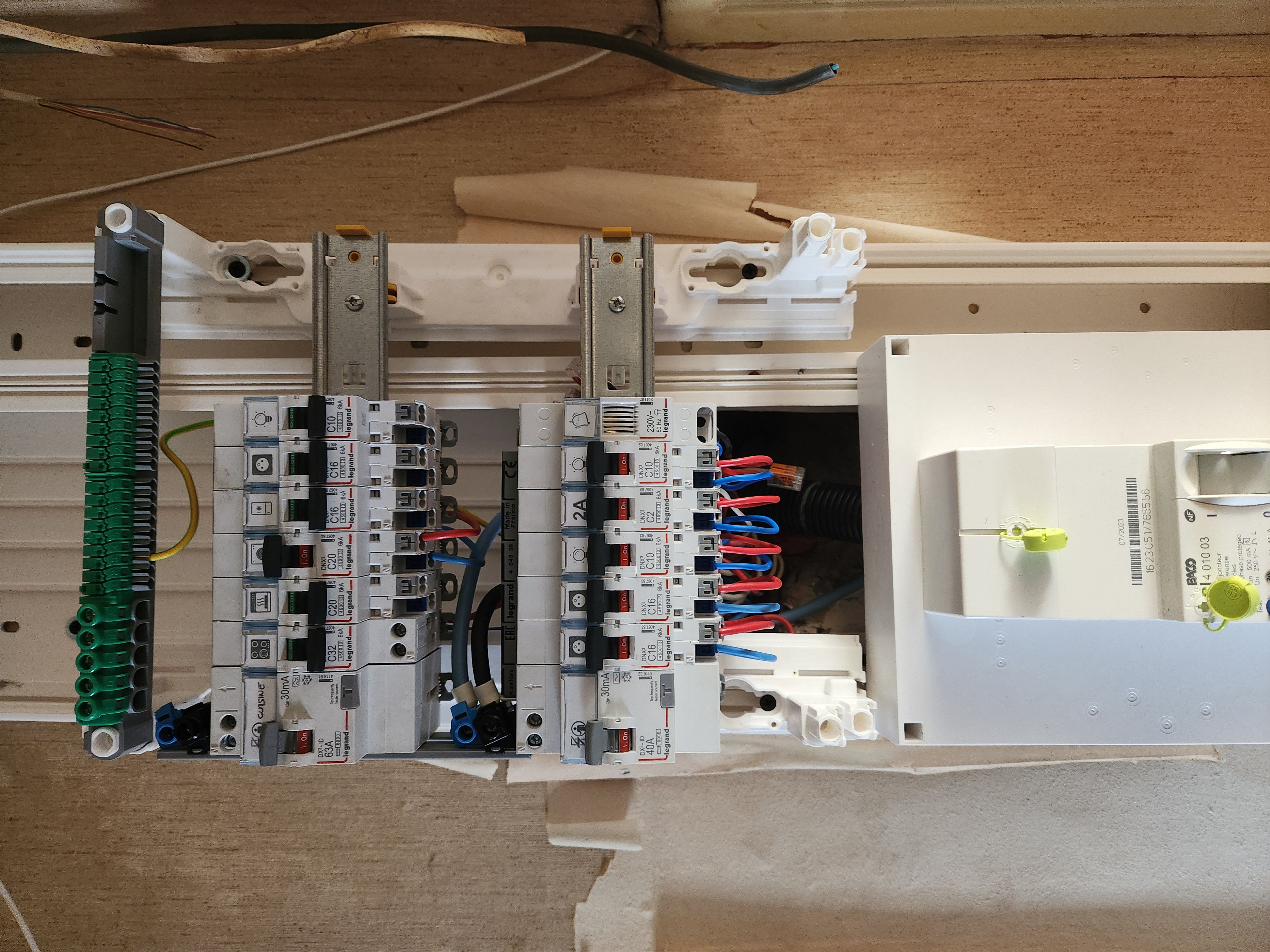 Voilà donc le résultat une fois posé. La première ligne est l'ensemble des prévisions de circuits pour la cuisine qui sera équipée ultérieurement. Il y a d'autres circuits en attente mais tout refonctionne et le client peut avancer dans les travaux de rénovation de son appartement. |