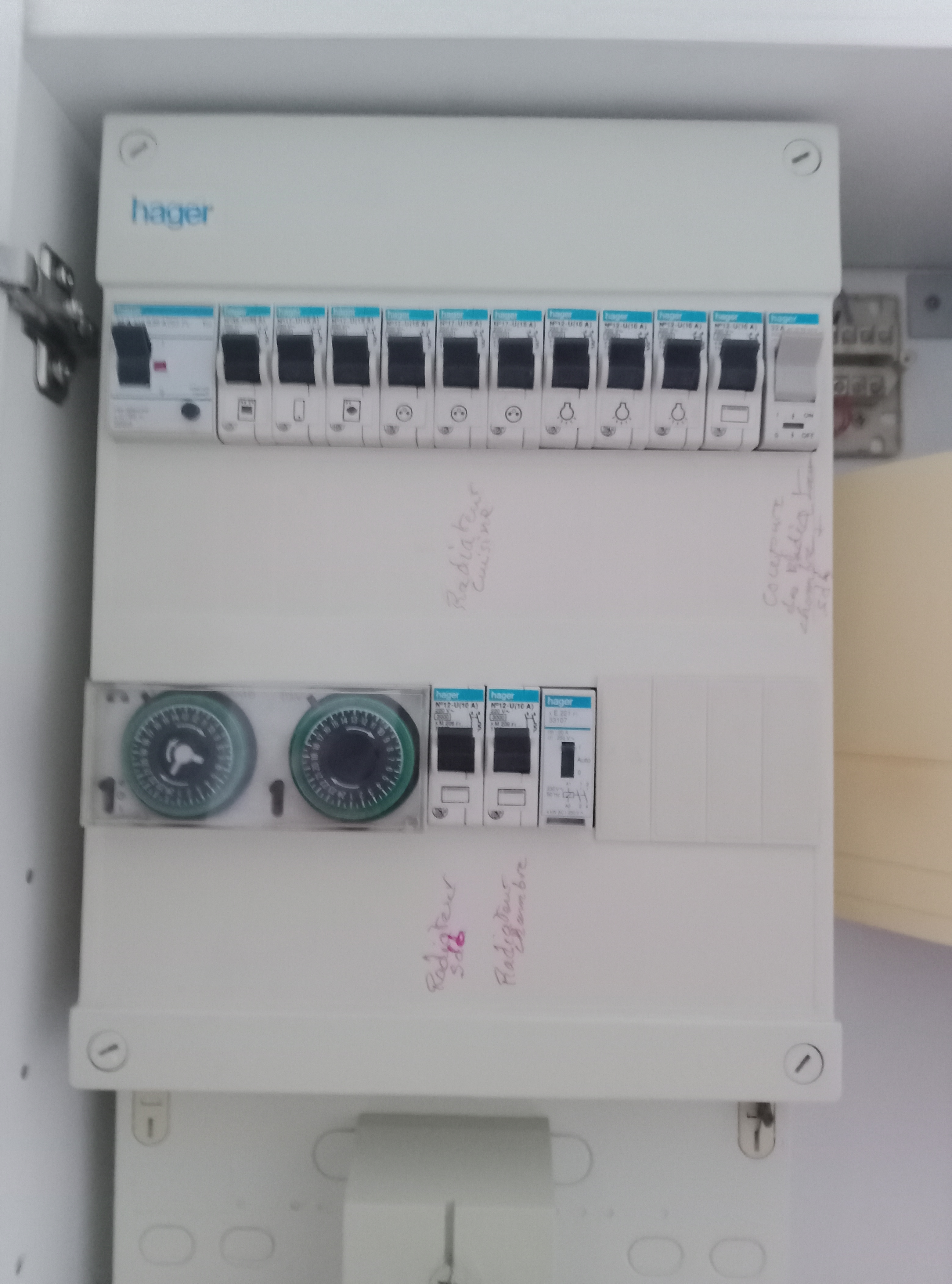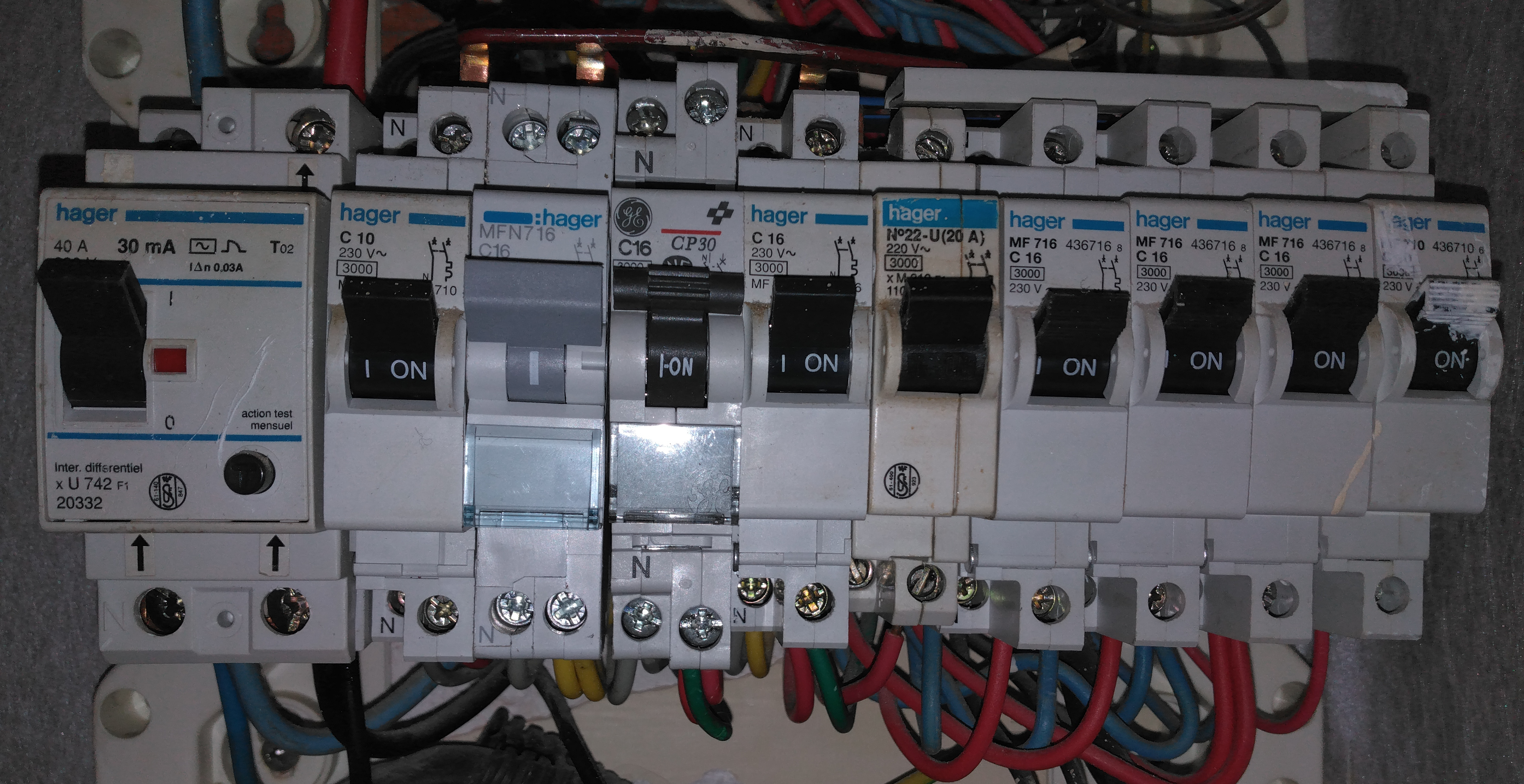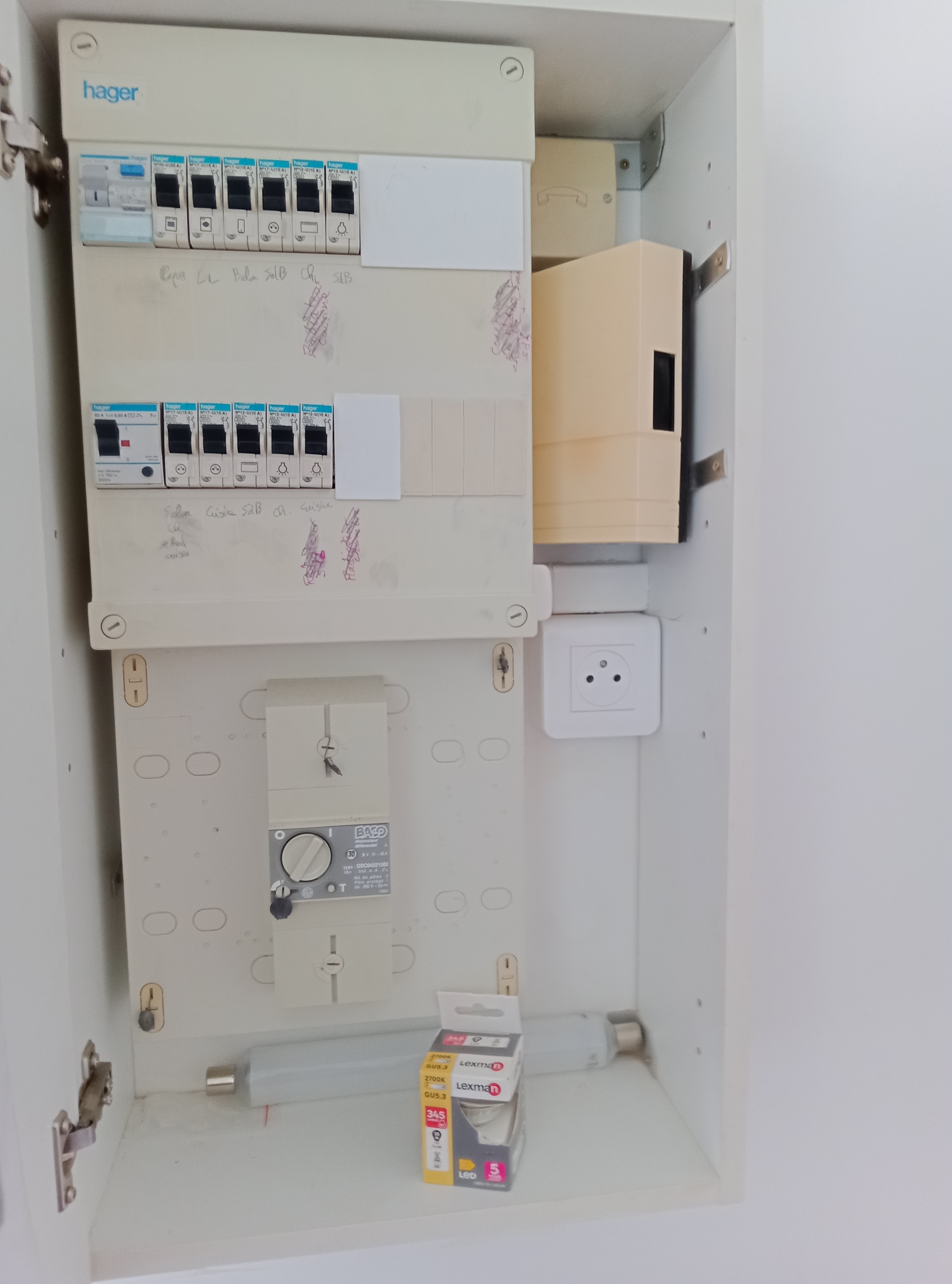 Voici donc l'objet du crime... Une fois démonté, on est pas mal aussi : il y a un code couleur particulier à respecter... (en gros, le rouge pour la phase, le gris pour le neutre et le noir pour la terre...) Le client veut procéder par étapes, pour le moment, on ne fait que le tableau. Comme je veux mettre en place une GTL, je lui demande de contacter ENEDIS pour remplacer son disjoncteur abonné (AGCP) qui est obsolète (il n'y a pas de bouton test). Je passerai cette procédure complexe de coordination avec ENEDIS pour pouvoir faire quelque chose de propre. Au troisième rendez-vous, c'était la bonne : je peux installer ma GTL et le technicien ENEDIS peut poser son AGCP. |